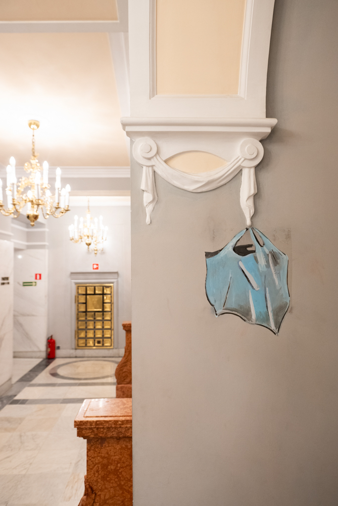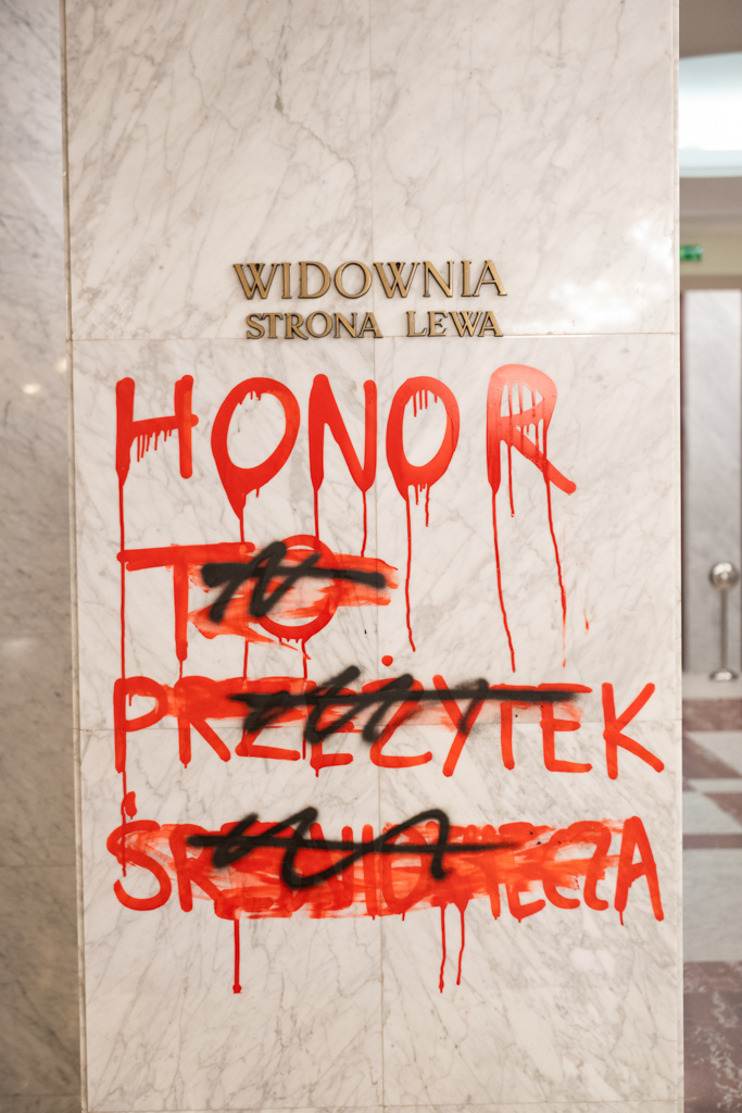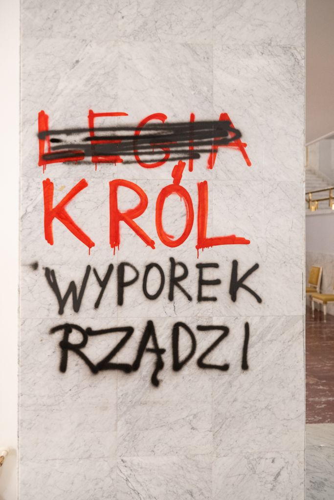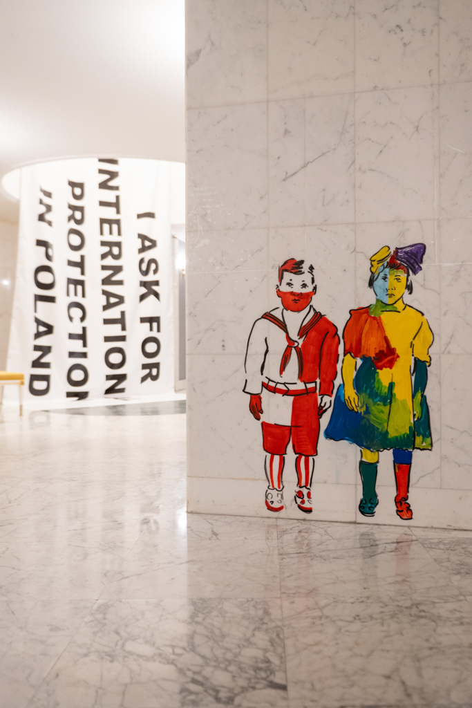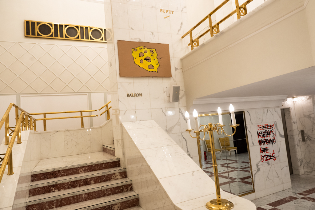 Pozostałe przestrzenie Teatru zachęcają niejako do gry w podchody. W zakamarkach budynku, na jego piętrach, schodach i ścianach wybrzmiewają słowa i symbole pochodzące zarówno z protestów, jak i z samego dramatu Tadeusza Micińskiego. Nie brak tu również rysunkowych prac Kiełbowicza, który daje się w ten sposób poznać jako kronikarz polskiej codzienności. Każdego dnia tworzy wizualny komentarz-kalambur.