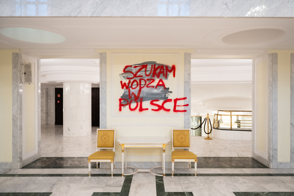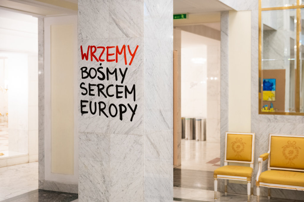 Kiełbowicz już od wejścia do Teatru wytrąca nas z bierności i zmusza do podjęcia działania. Powtarza akcję Deptanie Putina, która pierwotnie odbyła się w 2022 roku przed Ambasadą Rosji w reakcji na wybuch pełnoskalowej wojny w Ukrainie. Jeszcze silniej w tym kontekście wybrzmiewa praca wykorzystująca kieszonkowe wydanie Historii Polski – mogąca wywoływać skojarzenia z opowieścią Milana Kundery o „małych narodach”, których istnienie jest dla Zachodu nieoczywiste, a przez to niepewne.
